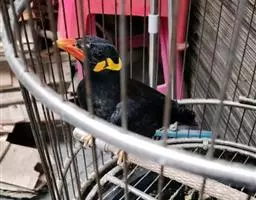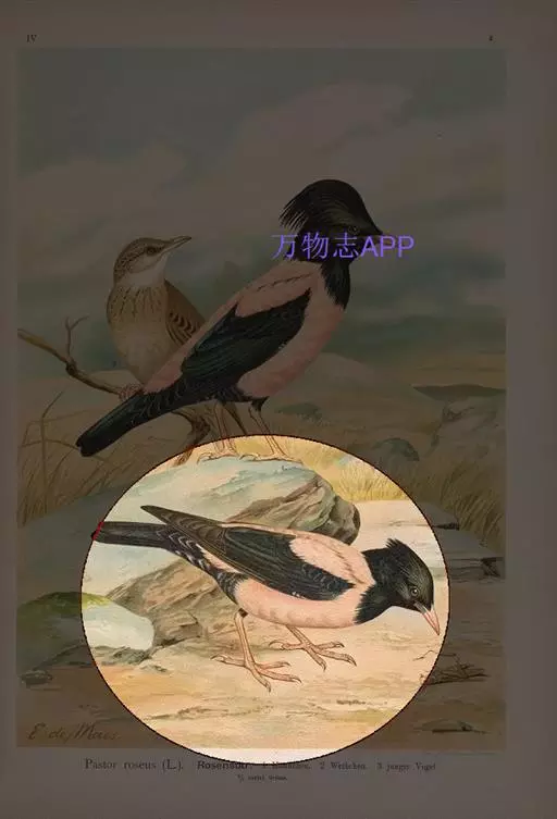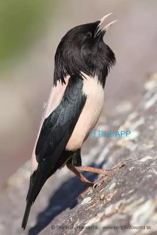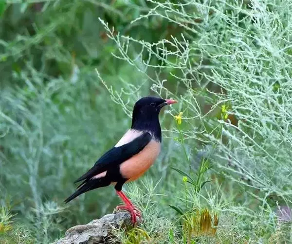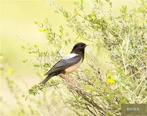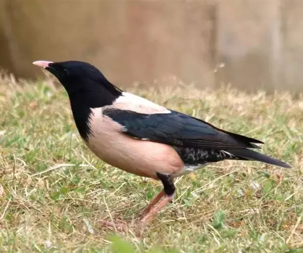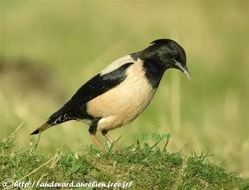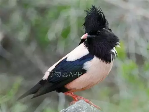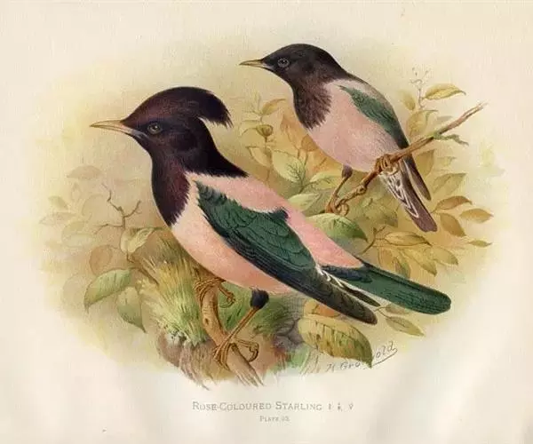 粉红椋鸟(学名:Sturnus roseus):中等体型,成鸟体长19-22厘米,体重60-73克,飞羽、尾羽为亮黑色,雌鸟与雄鸟毛色相似,但较黯淡。形似八哥,但背部及腹部粉红色,故称粉红椋鸟。余羽棕黑,十分可爱。雌鸟图纹相似但较黯淡。虹膜黑色;嘴粉褐色;脚粉褐色。飞行时发Ki-ki-ki的叫声,也有平淡的shrr声。群鸟进食时发出卷舌音chik-ik-ik-ik的叫声。