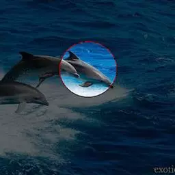 真海豚(学名:Delphinus),身体细而流线型。体色十分复杂而独特,通常十字交叉型,黄褐色在前灰色在后,背面黑色向下延伸,在背鳍下面形成V形区域。具白色胸斑。头前额喙平缓向倾斜,喙细长,相对较短。黑唇末端白色。背鳍大,位于体中央,形状从三角形至镰刀形。鳍肢中等大小,末端尖。尾鳍中等大小,后缘具明显的中央缺刻。