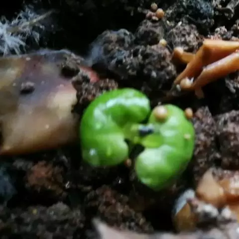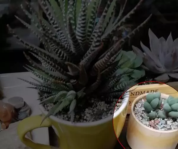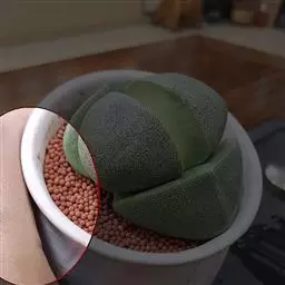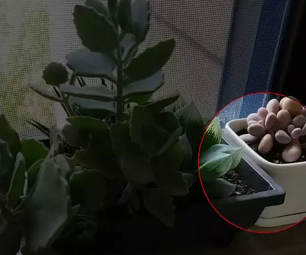 荒玉为番杏科生石花属,原产南非。株体呈白粉色,表面布满凹凸纹路,凹陷处为红褐色,每年秋季开黄花。