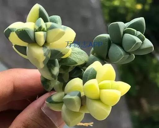 叶交互对生,2片叶位于基部合生。叶半月形,三棱状,粉绿色至灰绿色;叶端狭窄,先端尖锐,叶尖微粉红色,叶背有龙骨状突起,侧芽至叶腋伸出。叶长2.5-3.5厘米,宽0.3-0.4厘米,全株密被极细短绒毛。