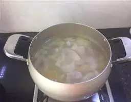 4.鲜虾去壳去泥肠,背部剖开1/3,去除虾线;鱿鱼剖开腹部去内脏,在内侧用刀斜切十字花刀,注意切到肉的厚度的2/3即可,不要切断,然后切成小块待用,鸡蛋打散待用;锅中放入足够多的水,大约5碗,烧开以后,放入虾及鱿鱼煮断生;