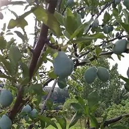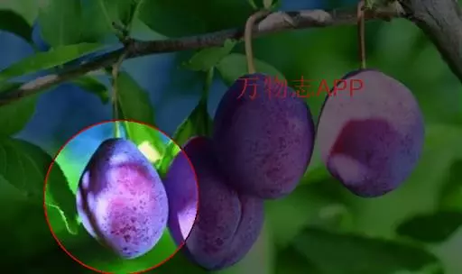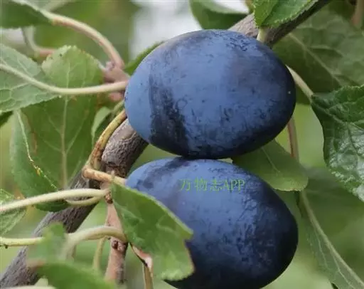 核果通常卵球形到长圆形,稀近球形,直径1~2.5cm,通常有明显侧沟,红色、紫色、绿色、黄色、常被蓝色果粉,果肉离核或粘核;核广椭圆形,顶端有尖头,表面平滑,起伏不平或稍有蜂窝状隆起;果梗长约1.2cm,无毛。花期5月,果期9月。2n=48。