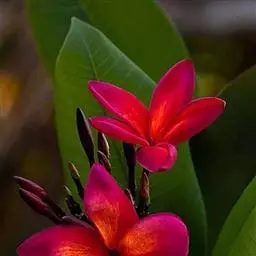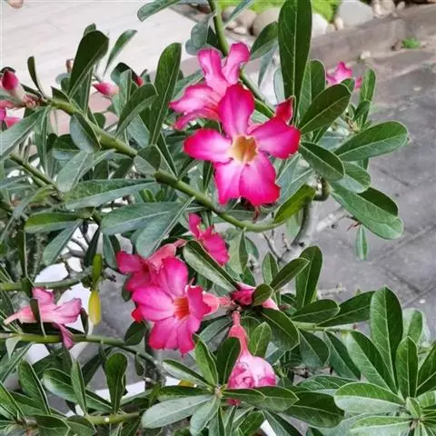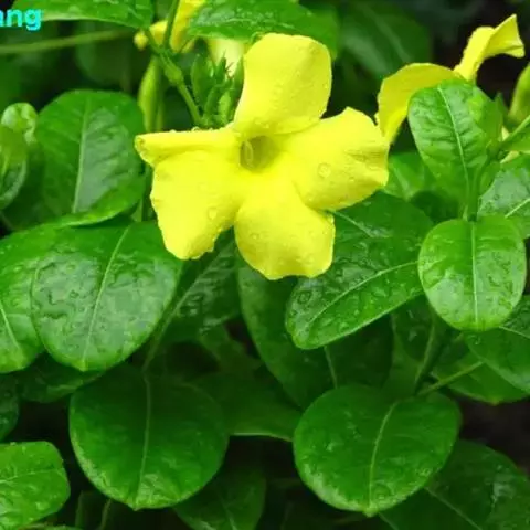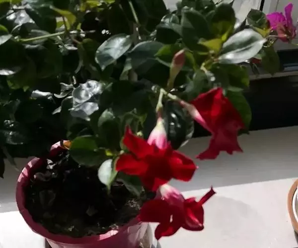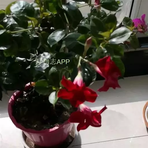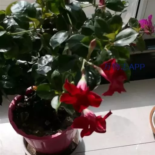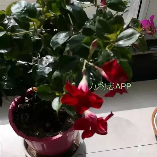 常绿藤本灌木。全株有白色乳汁,叶对生或3-4叶轮生,全缘,长卵圆形,长15-20厘米,宽5-10厘米,先端急尖,革质,叶面有皱褶,叶色浓绿并富有光泽。花腋生,花冠漏斗形,长10-15厘米,径约10厘米,漏斗状,花冠5裂桃红色,花色为红色、桃红色、橙红色,粉红等。花期主要为夏、秋两季。