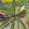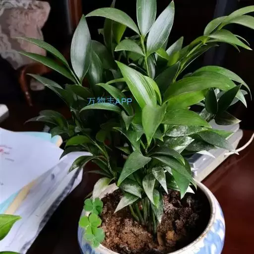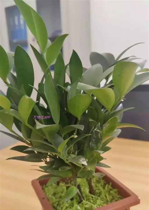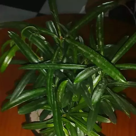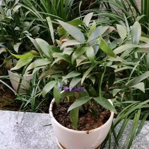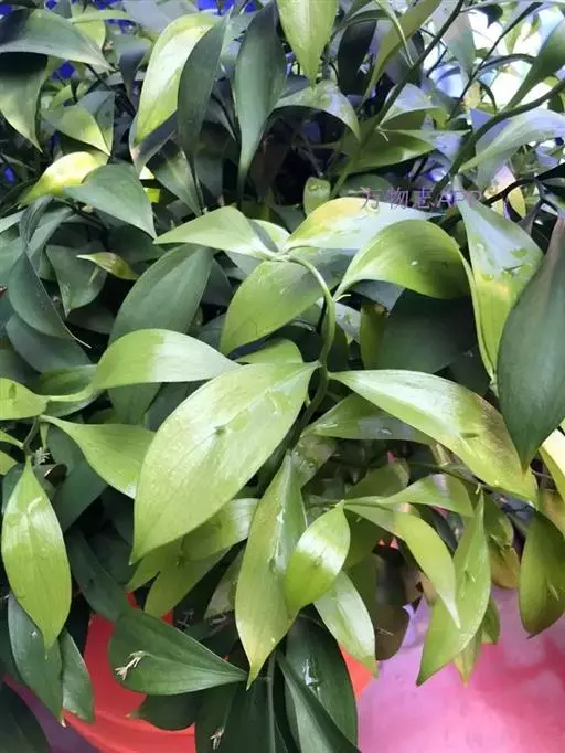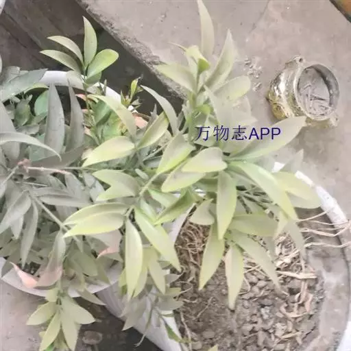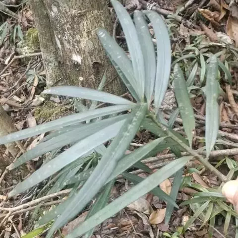 竹柏 叶对生,革质,长卵形、卵状披针形或披针状椭圆形,有多数并列的细脉,无中脉,长3.5-9厘米,宽1.5-2.5厘米,上面深绿色,有光泽,下面浅绿色,上部渐窄,基部楔形或宽楔形,向下窄成柄状。