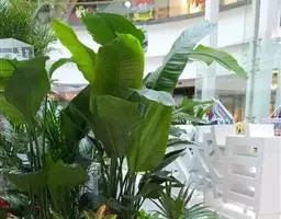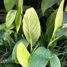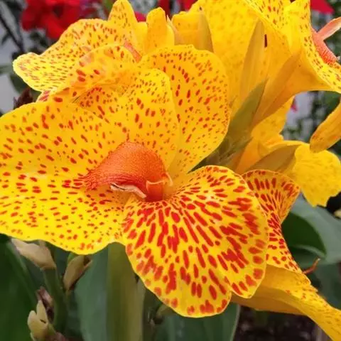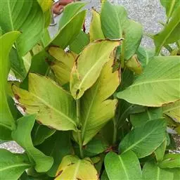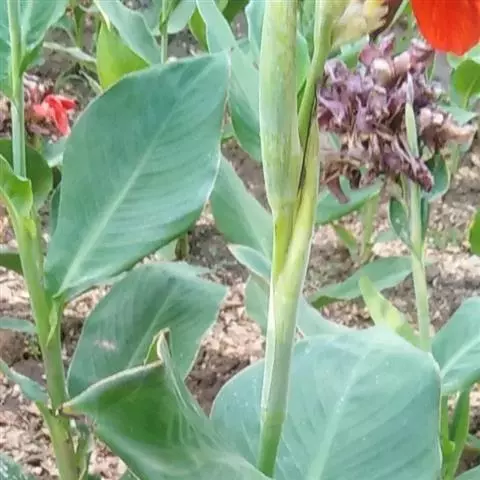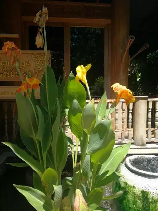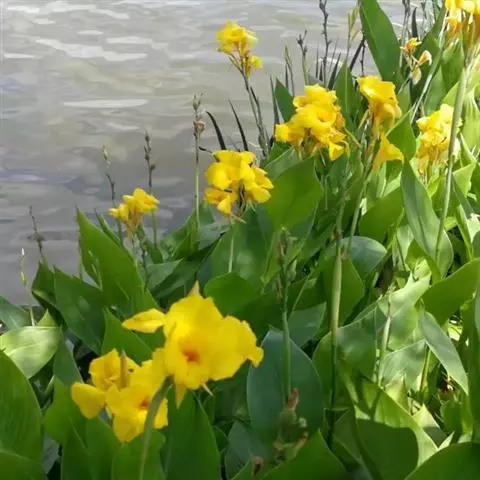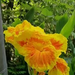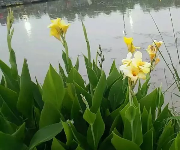 黄花美人蕉(学名:Canna indica L. var. flava Roxb.):多年生草本植物,高可达1.5米,全株绿色无毛,被蜡质白粉。具块状根茎。地上枝丛生。单叶互生;具鞘状的叶柄;叶片卵状长圆形。总状花序,花单生或对生;萼片3,绿白色;花冠、退化雄蕊杏黄色与正种美人蕉不同。唇瓣披针形,弯曲;蒴里,长卵形,绿色,花、果期3-12月。