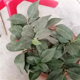 小乔木,高5-7米,树皮红色,嫩枝无毛。叶硬革质,倒卵状椭圆形至椭圆形,长8-12厘米,宽4-5厘米,先端短尖,尖头钝,基部楔形,上面深绿色,下面灰绿色,无毛,侧脉约6对,在上面不明显,在下面明显突起,边缘有细钝齿,叶柄长6-10毫米,无毛。