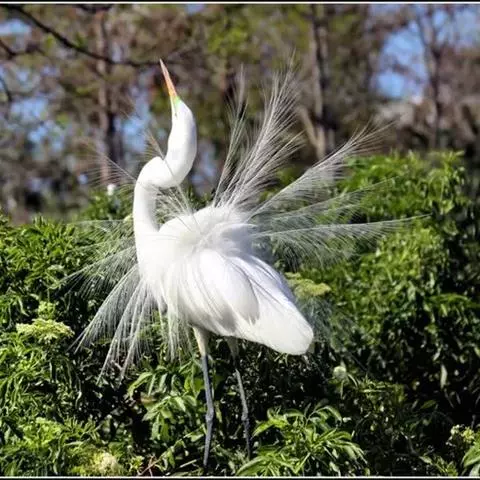 雪鹭是一种小型涉禽,体长47.5-68厘米,翼展84-105厘米,体重290-475克。以其壮观的交配展示,疯狂的觅食行为和美丽的全白羽毛而闻名。在繁殖季节期间,这只中型鹭鸟沿着脖子、胸部和背部以及头部后颈形成一条短而粗糙的嵴,形成长而细的丝状蓑羽。在繁殖季节的高峰期,鼻孔和眼睛之间裸露的区域会由黄色变成红色。脚上的黄色也变的明亮和更加丰富,常常带有淡红或橙色的色调。繁殖的雄性和雌性看起来很相似,幼鸟类似非繁殖期的成鸟,喙基略苍白,腿背部绿色,这种颜色延伸到小腿到膝关节。在觅食时,白鹭直立行走,脖子略微拱起,翅膀深深地拍打着翅膀,黄色的脚明显地拖着身体后部。