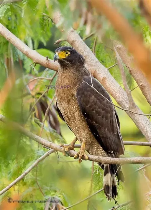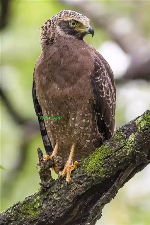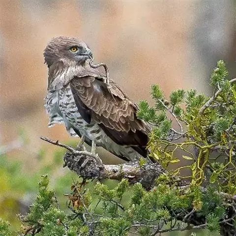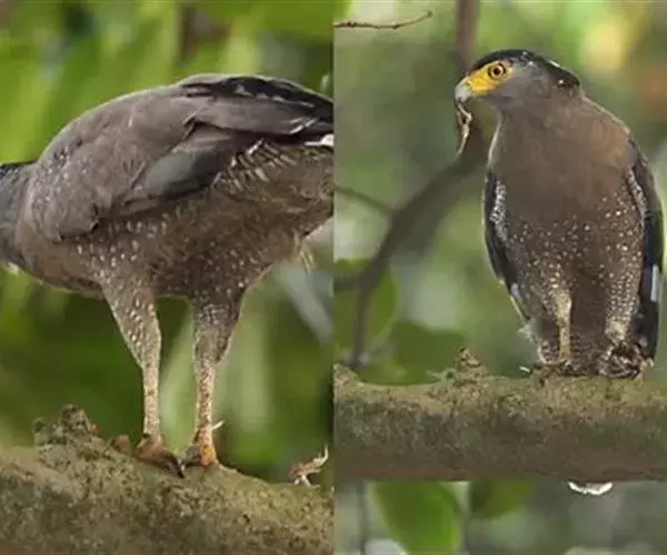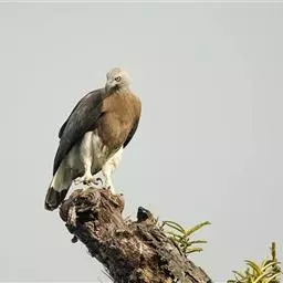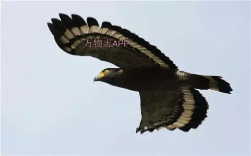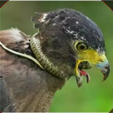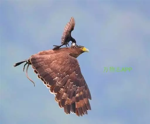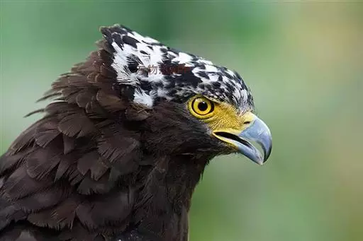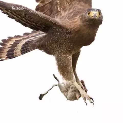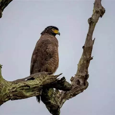 蛇雕(学名:Spilornis cheela):共有21个亚种。全长61-73厘米,大中型鹰类。头顶具黑色杂白的圆形羽冠,覆盖后头。上体暗褐色,下体土黄色,颏、喉具暗褐色细横纹,腹部有黑白两色虫眼斑。飞羽暗褐色,羽端具白色羽缘;尾黑色,中间有一条宽的淡褐色带斑:尾下覆羽白色。喙灰绿色,蜡膜黄色。跗蹠及趾黄色,爪黑色。