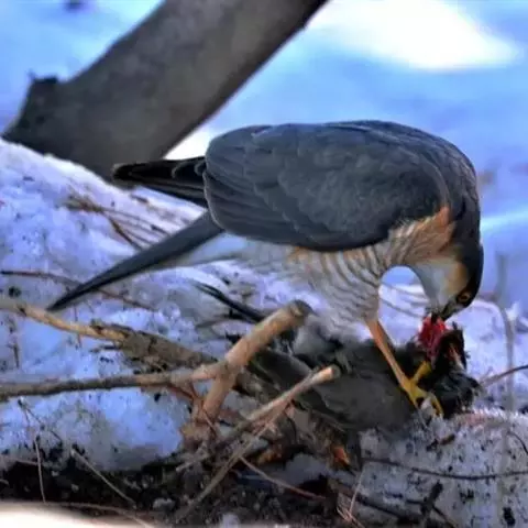 由于捉到蛇后大多是囫囵吞食,不需要撕扯,所以蛇雕的嘴没有其他猛禽发达。但它的颚肌非常强大,能将蛇的头部一口咬碎,然后首先吞进蛇的头部,接着是蛇的身体,最后是蛇的尾巴。在饲喂雏鸟的季节,成鸟捕捉到蛇后,并不全部吞下,往往将蛇的尾巴留在嘴的外边,以便回到巢中后,能使雏鸟叼住这段尾巴,然后将整个蛇的身体拉出来吃掉。