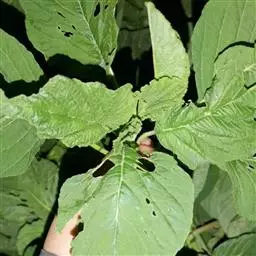 (4)病虫害防治 病害主要有白锈病,该病6月上旬开始发生,高温高湿条件发病重。得病植株叶面出现黄色病斑,叶背形成白色的孢子堆。防治可用50%代森锰锌800倍液,或50%的甲基托布津600倍液,或40%粉锈宁500倍液喷洒。每隔7~10天喷1次,连喷2~3次,防治效果好。虫害主要有蚜虫危害,可用40%乐果1500倍液喷雾防治。