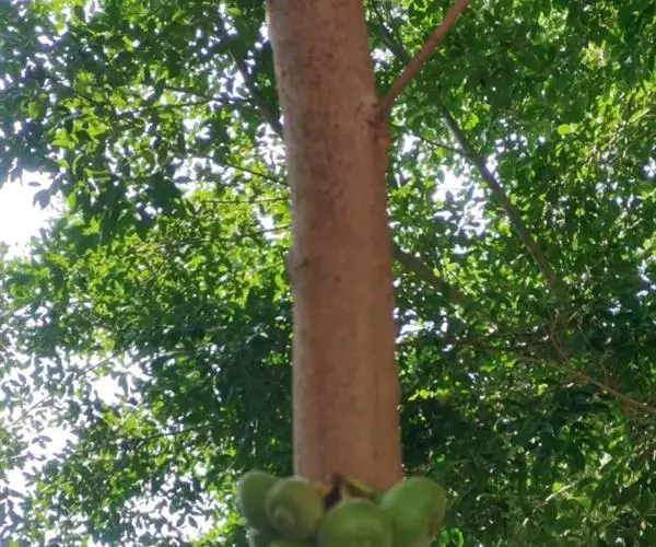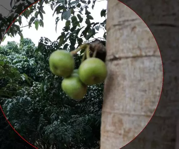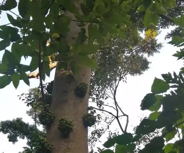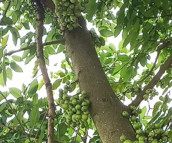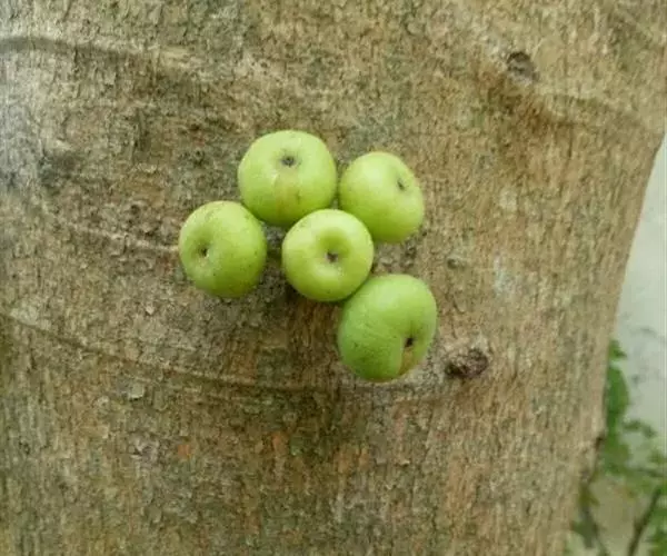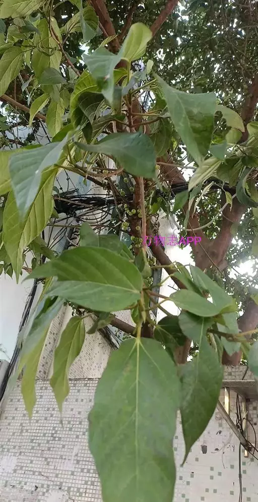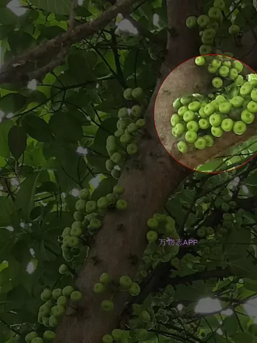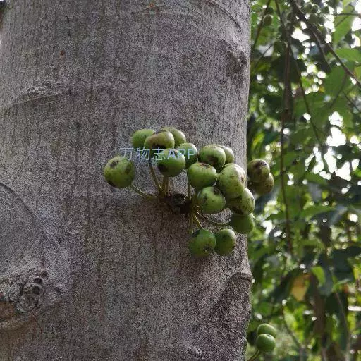 乔木,高7-10米,树皮灰褐色,平滑,胸径10-15(-17)厘米,幼枝绿色,微 被柔毛。叶互生,厚纸质,广卵形至卵状椭圆形,长10-17厘米,顶端渐尖或钝,基部 圆形至浅心形,边缘波状或具浅疏锯齿;幼叶背面被柔毛,基生叶脉5条,近基部的2条 细小,侧脉4-6对;叶柄长2.5-6厘米,托叶卵状披针形,无毛,长1-1.5厘米。榕 果簇生于老茎发出的瘤状短枝上,球形,直径2.5-3厘米,顶部微压扁,顶生苞片卵圆 形,脐状微凸起,基生苞片3,早落,残存环状疤痕,成熟榕果红色,有绿色条纹和斑点; 总梗长2-4厘米;雄花生榕果内壁口部,花被片3-4,宽卵形,雄蕊2,花丝基部合生 成一柄;瘿花生内壁近口部,花被合生,管状,顶端4-5齿裂,包围子房,花柱侧生, 短,柱头漏斗形;雌花生于雌植株榕果内壁,花被片3-4,条状披针形,薄膜质,基部 合生。瘦果倒卵形,薄被瘤体,花柱与瘦果等长,柱头棒状,无毛。花期冬季。