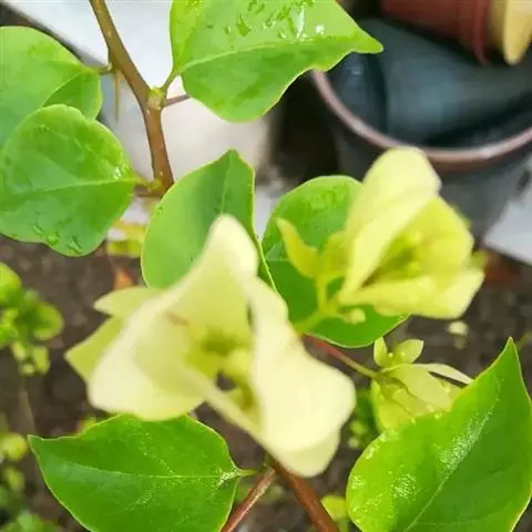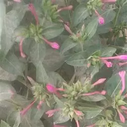 即紫茉莉,英文名:Four-o'clock,Marvel of Peru,为紫茉莉科、紫茉莉属多年生草本植物,一年生栽培。株高50~80cm。根粗壮,茎多分枝而散生。叶对生,卵形或心脏形。花数朵簇生总苞上,径达3.8cm;花萼呈花瓣状,喇叭形,筒长4—6.5cm,红、橙、黄、白等色或有条纹、斑块或两色相间,芳香。果黑色,卵圆形,表面皱缩有棱,俗称“小地雷”,种子球形,黑色。适于庭院栽培,黄昏散发浓香。叶、胚乳可制化妆用香粉;根、叶可入药。