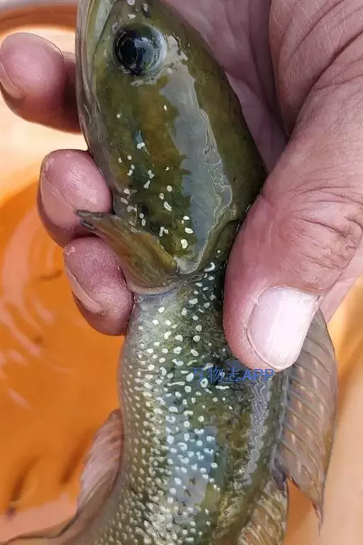 体背部黄褐色或灰褐色,腹部浅黄色或灰白色,体侧有少数大型不规则的块状暗斑;各鳍均带浅红色或浅灰色。繁殖季节性成熟雄性个体的吻部和臀鳍、尾鳍以及体后部均有白色颗粒状的珠星。