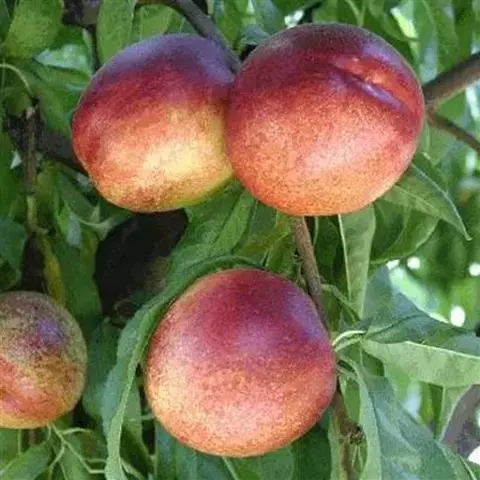 油桃 色点或晕,不易剥离。果肉白色,肉质细,硬溶质,味甜,风味较浓,黏核,鲜核重82克。含可溶性固形物7.4%~10.5%,可溶性糖7.0228%,可滴定酸0.3624%,维生素C7.682 8毫克100克。北京地区7月8 ~15日成熟。 树势强健,树冠较大,发枝力强。复花芽较多,占50%。果实7月上中旬采收,果实发育期85天左右。落叶期为10月下旬,年生育期210天左右。树姿半开张,一年生枝绿色,阳面红褐色。叶长椭圆披针形,叶面平展或略有皱,叶基楔形,叶尖渐尖,深绿色,具有光泽,蜜腺肾形,2~5个。花为铃形,雌蕊高于雄蕊,花粉多。该品种为优良的早熟油桃品种,果个大且圆整,风味甜,丰产。多雨年份有少量裂果。