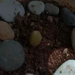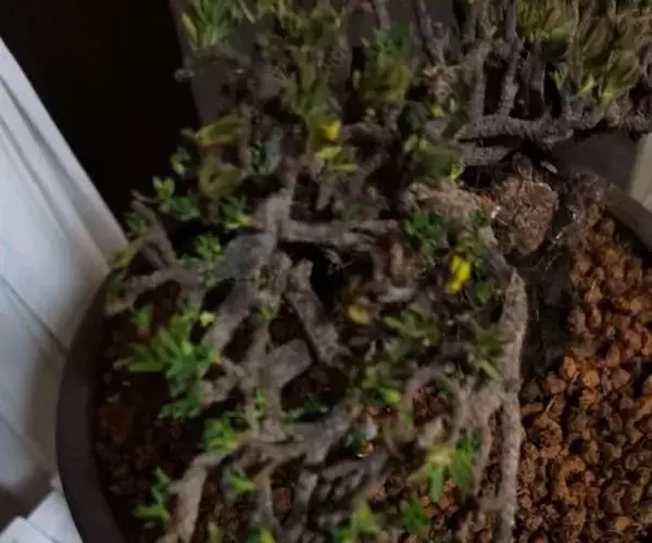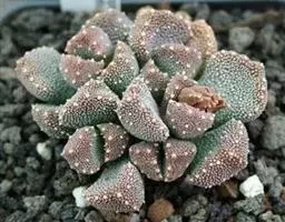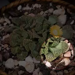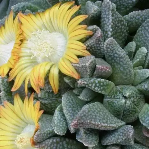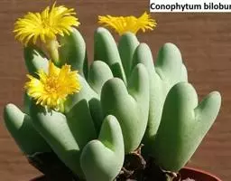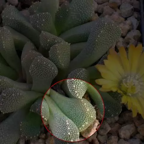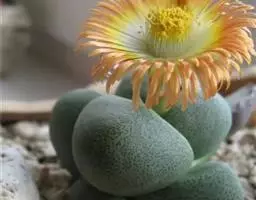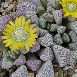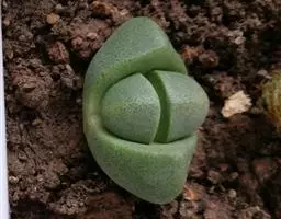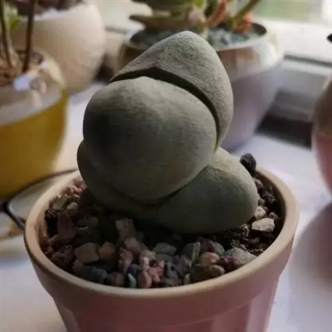 荒玉为番杏科生石花属,原产南非。株体呈白粉色,表面布满凹凸纹路,凹陷处为红褐色,每年秋季开黄花。