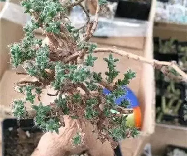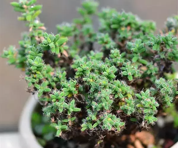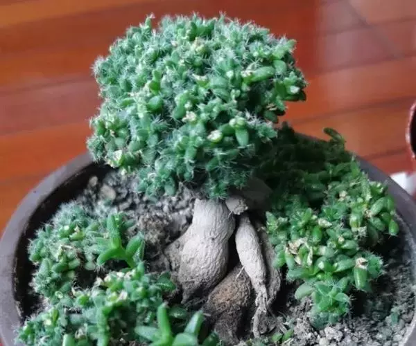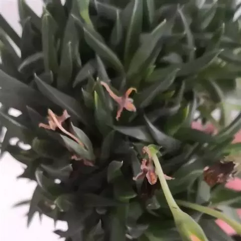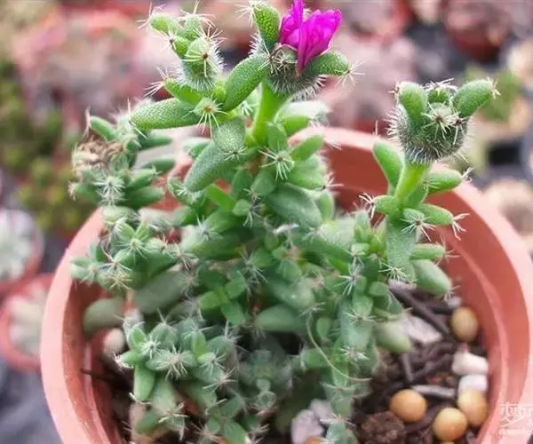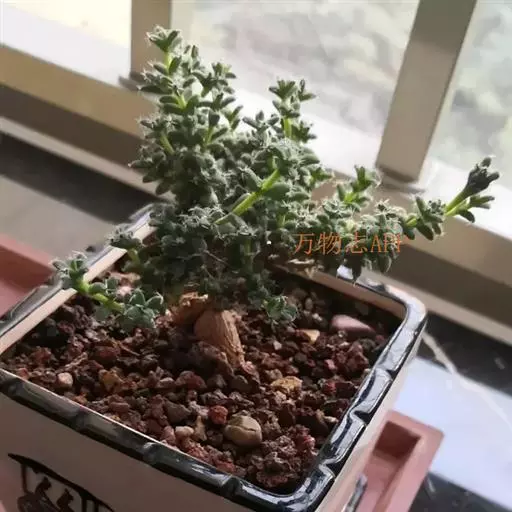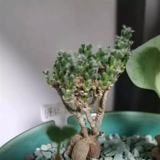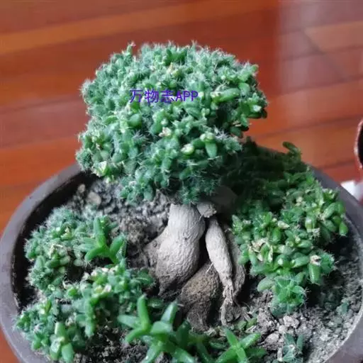多年生肉质矮灌木,株高7-12厘米。灰白色,茎干膨大、肥厚且多汁。分枝性强,枝条黄褐色,嫩枝绿色。绿色纺锤形小叶对生,小叶长0.8-2厘米。叶端丛生白色短细毛。小花桃红色,着生于枝条顶部。花期舂、秋季。 姬红小松