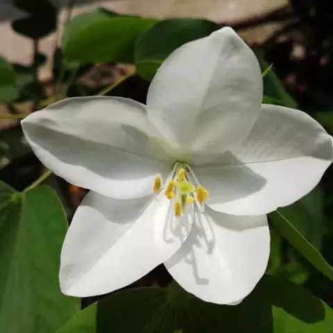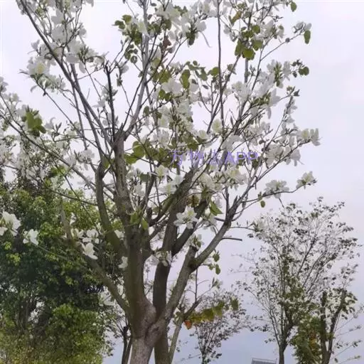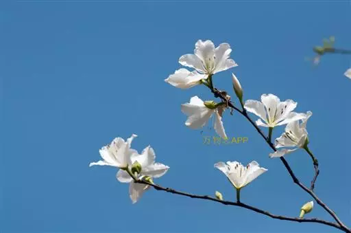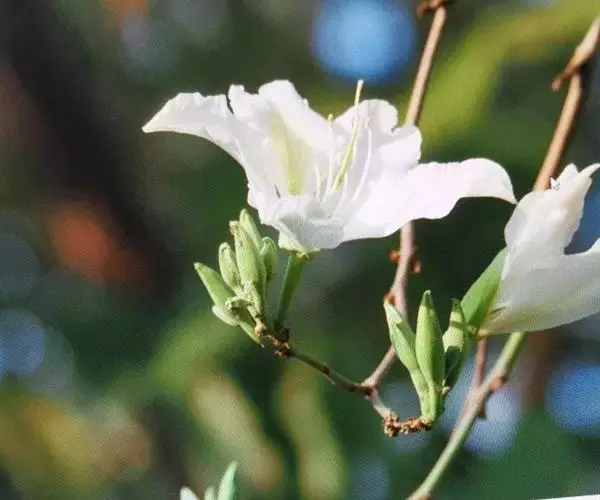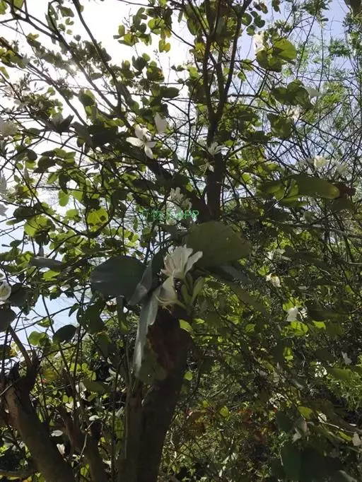 白花羊蹄甲的花数朵聚生,芳香,五杖分离花瓣,观赏花,白色。花期:春天,春天开花,先开花后才出叶,树上一片白色,相当容易辨认。