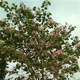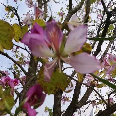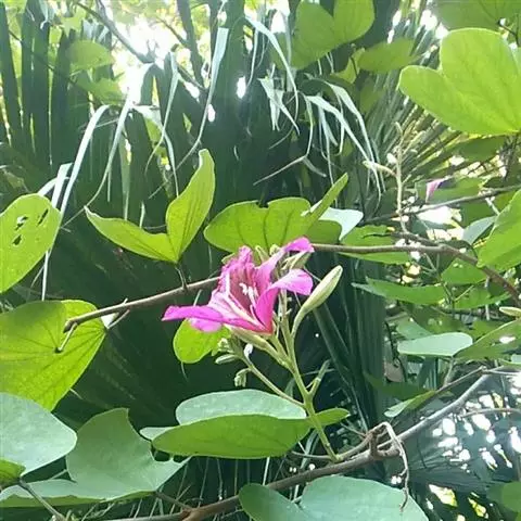 洋紫荆:落叶乔木;树皮暗褐色,近光滑;幼嫩部分常被灰色短柔毛;枝广展,硬而稍呈之字曲折,无毛。叶近…