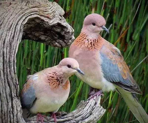 棕斑鸠(学名:Spilopelia senegalensis):体重95-121克,体长250-288毫米。是一种粉褐色斑鸠。尾长而翼短。与灰斑鸠区别在体型较小,无黑色颈环,色彩较深,更似欧斑鸠。无欧斑鸠那种颈部和翼上的图纹,但具带黑色斑点的褐色颈带。外侧尾羽羽端白,具独特的蓝灰色翼斑。虹膜褐色,嘴灰色,脚粉红。