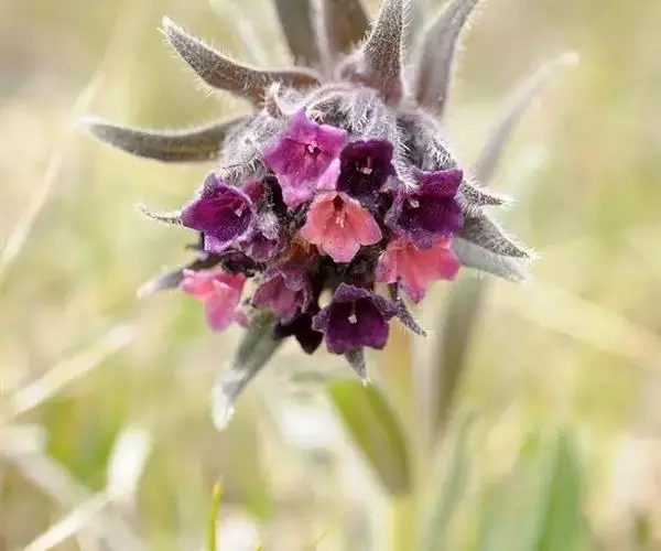 镰状聚伞花序生茎上部叶腋,长2~6厘米,最初有时密集成头状,含多数花;苞片披针形;花萼裂片线形,长1.2~1.6厘米,果期可达3厘米,先端微尖,两面均密生淡黄色硬毛;花冠筒状钟形,深紫色,有时淡黄色带紫红色,外面无毛或稍有短毛,筒部直,长1~1.4厘米,檐部直径6-10毫米,裂片卵形,开展;雄蕊着生于花冠筒中部(长柱花)或喉部(短柱花),花药长约2.5毫米;花柱长达喉部(长柱花)或仅达花筒中部(短柱花),先端浅2裂,柱头2,倒卵形。