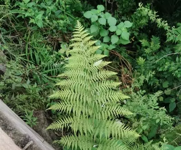 植株高60-150厘米。根状茎短而斜升,连同叶柄基部被深棕色的披针形、边缘具疏毛的鳞片。叶簇生;叶柄长30-70厘米,粗约3-6毫米,禾秆色,基部以上光滑;叶片几与叶柄等长,下部宽30-45厘米,三角状卵形,先端渐尖并羽裂,基部不变狭,三回羽裂;羽片约14对,斜向上,互生,或下部的对生,相距5-10厘米,柄长达2厘米或过之,基部一对较大,长达20厘米,宽达5厘米,长圆披针形,先端渐尖并羽裂,渐尖头,向基部略变狭,第二对以上各对羽片渐次缩小,向基部不变狭,柄长0.1-0.4厘米,二回羽裂;小羽片15-20对,互生,开展,中部的较大,长3.5-8厘米,宽1-2.5厘米,披针形,渐尖头,基部圆截形,对称,无柄(下部的有短柄),多少下延(上部的彼此以狭翅相连),深羽裂几达小羽轴;裂片约10-15对,开展,长5-12毫米,宽2-3.5毫米,先端钝或钝尖,基部沿小羽轴彼此以狭翅相连,边缘全缘或锐裂。叶脉下面明显,侧脉单一或在具锐裂的裂片上二叉,斜上,每裂片4-8对。叶草质,干后黄绿色,两面光滑无毛,仅下面有橙黄色、透明的头状腺毛,或沿小羽轴及主脉的近顶端偶有少数单细胞的针状毛,上面沿羽轴及小羽轴被灰白色的短针毛,羽轴常具浅紫红色斑。孢子囊群小,圆形,每裂片3-6对,生于侧脉的近顶部;囊群盖小,圆肾形,灰绿色,光滑,成熟时脱落或隐没于囊群中。孢子圆肾形,周壁表面形成不规则的小疣块状,有时连接成拟网状或网状。
