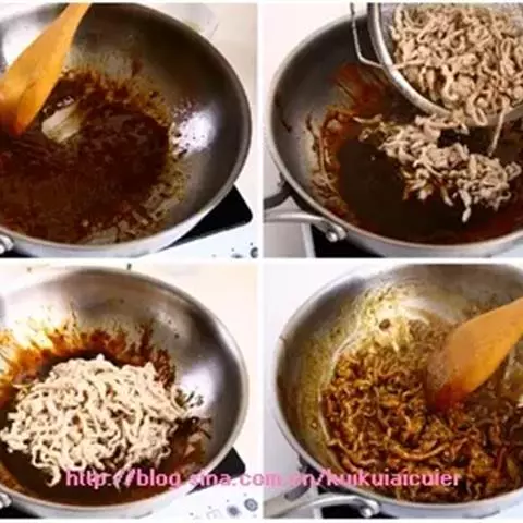 4. 炒锅用旺火烧热,放入花生油,烧至五成热,下海虾泡油至八成熟,连油一起倒入笊篱沥去油;