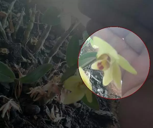 总状花序从具叶或落了叶的老茎上部发出,通常具2-5朵花;花序轴多少回折状弯曲,长3-4厘米;花序柄长5-10毫米,基部被3-4枚短的膜质鞘;花苞片狭披针形,长3-6毫米,先端锐尖;花梗和子房长2-4厘米;花黄绿色,后来转变为乳黄色,开展;中萼片卵状长圆形,长1.5-1.7厘米,宽5-6毫米,先端急尖或稍钝,具5条脉;侧萼片多少斜三角形,与中萼片等长,基部歪斜,宽1-1.3厘米,先端急尖。