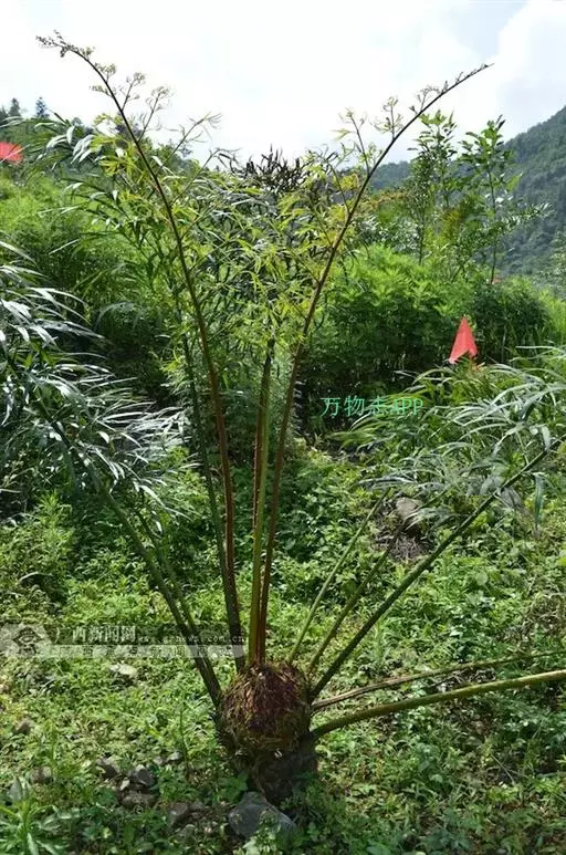 常绿木本植物,树干粗壮,圆柱形, 树干高20-40厘米,直径10-20厘米,褐灰色,叶片只有1片,稀2片,顶生,直立,长达3.5米,宽0.7米。羽片三回羽状,馒形。具12-18枚近对生的一回羽片,以60-90°夹角丛主轴展开,横断面观,以100-130°夹角从主轴上向上张开成龙骨状;一回羽片披针形,中下部一对最长,长35-45厘米,宽12-15厘米,向着两端的逐渐变短,长15-30厘米,宽5-10厘米。具7-11枚互生的二回羽片,横断面观,以95-110°夹角从次级轴上张开成龙骨状。二回羽片扇形或倒三角形,长10-18厘米,宽4-14厘米,(2-)3-5次二歧分枝,在中央,尤在下半部形成合轴,柄长0.5-4厘米。小叶(小羽片)革质,倒卵状条形,长7-12厘米,宽1.0-1.5厘米,先端渐尖,基部渐狭,并下延1.5- 4.0厘米;上面具光泽,深绿色,下面淡绿色,中脉两面稍隆起,下面后变无毛,边缘平或微波状。叶柄近圆柱状,长达2米,粗达2.5厘米;约40对,着生于柄基部至近顶端,圆锥状,微扁,长3-5毫米,刺间距3-5厘米。球花(果)未见。