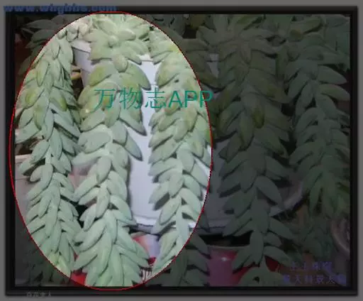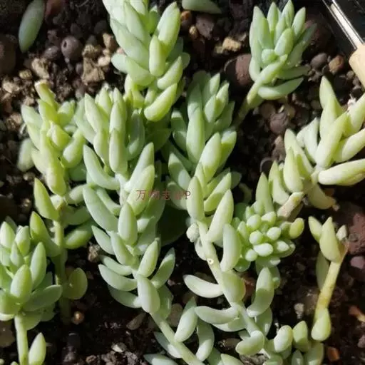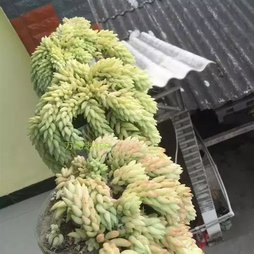 玉缀群生 玉缀 Sedum morganianum 名字起源于日本,日本考古学家在挖掘古坟时,发现一些由玉或玛瑙等宝石制成的玉饰,这些玉饰的造型弯曲如勾,所以便称为“勾玉”,这在日本漫画、小说中相当常见。后来多肉植物界引进玉缀时,观察她叶片的形状很像勾玉,而整串的叶片犹如成串的勾玉,所以这植物便命名为玉つづり,つづり日文就是“缀”,缀玉成串的多肉植物便是“玉缀”,很好听且达意的名字。当然引申意思也可以称为“玉串”或“玉帘”,因此玉缀的别名也有玉帘、玉串、玉珠帘。