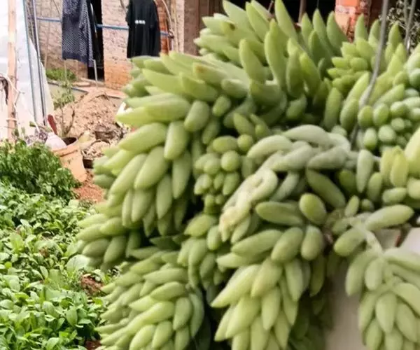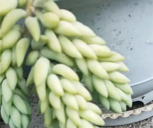 玉缀茎匍匐生长,故常悬挂栽培任其下垂。叶片披针形弯曲如香蕉,叶端尖,长度约2cm,叶色青绿带有透明感,叶表裹着一层粉,看起来非常粉嫩。花梗从枝端的叶腋凑出,通常会从不同叶腋抽生出几个花梗,一个花梗一朵花,花朵钟形桃红色,玲珑精致。