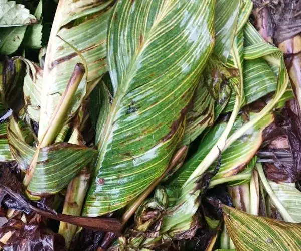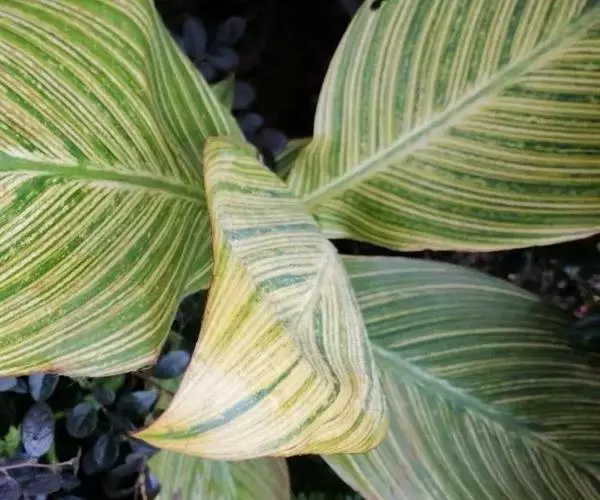 金脉美人蕉叶片淡黄色,叶脉绿化,叶缘具红边,全缘,大花美人蕉之变种