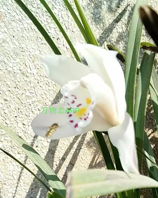 花葶从假鳞茎下部叶腋发出,直立或近直立,长25-40厘米;总状花序具1-2(-3)朵花;花苞片卵状三角形,长6-7毫米;花梗和子房长2.5-3.5厘米;花较大,不完全开放,稍有香气;萼片与花瓣白色,有时略有粉红色晕,唇瓣亦白色,中裂片中央至基部有一黄色斑块,连接于黄色褶片末端,偶见紫粉红色斑点,蕊柱白色或稍带淡粉红色,有时基部有黄色斑块;萼片狭长圆状倒卵形,长5.5-7厘米,宽1.5-2厘米,先端常略钝。