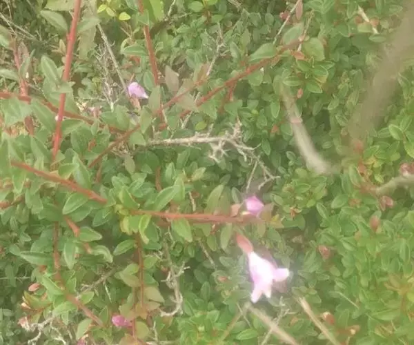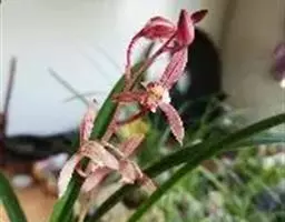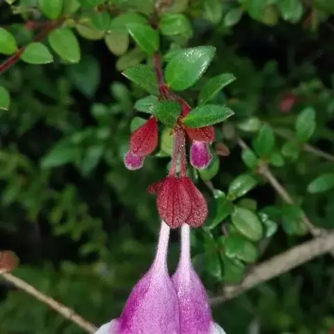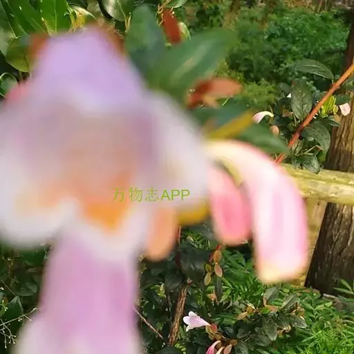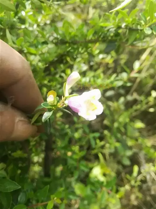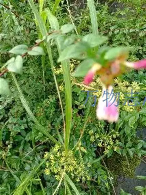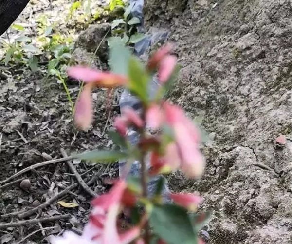 花生于侧生短枝顶端叶腋,由未伸长的带叶花枝构成聚伞花序状;萼筒细长,萼檐2裂,裂片椭圆形,长约1厘米,与萼筒等长;花冠红色,狭钟形,5裂,稍呈二唇形,上唇3裂,下唇2裂,筒基部两侧不等,具浅囊;雄蕊4枚,着生于花冠筒中部,花药长柱形,花丝白色;花柱与雄蕊等长,柱头头状,稍伸出花冠喉部。