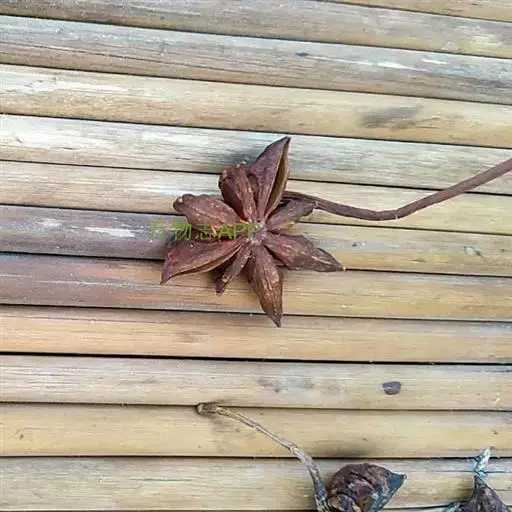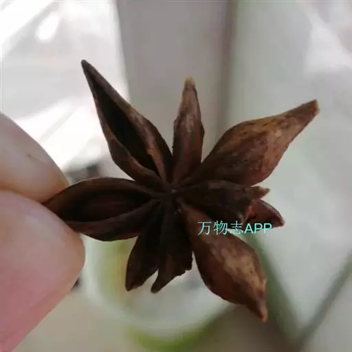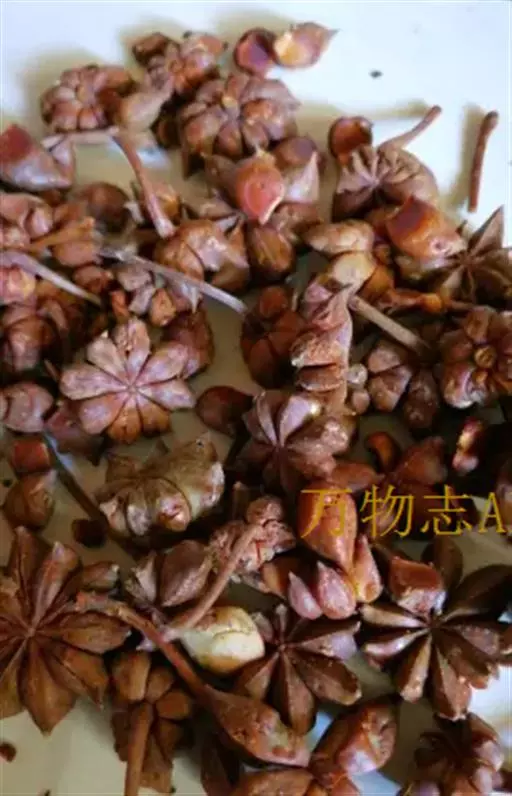 短柱八角:由10-13个果组成,单一果呈小艇形,长1.8-2.3厘米,宽1.5-1.8厘米,先端急尖,顶端不弯曲,果皮略厚,臭微,味微苦,辣,麻舌。
