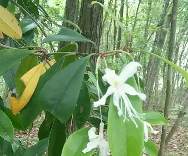 花常3-5朵簇生枝顶叶腋;花梗长2-2.5厘米,无毛;花萼小,微5裂,裂片三角形;花冠白色,有时蔷薇色,漏斗形,长3-3.3厘米,5深裂,裂片倒卵形或长圆状倒卵形,长2-2.5厘米,上方裂片内侧具黄色斑点,花冠管筒状,长1.3厘米,向基部渐狭;雄蕊10,细长,伸出于花冠外很长,花丝下部被微柔毛或近于无毛;子房圆柱形,长4毫米,无毛,花柱长4-5厘米,超过雄蕊,无毛,柱头头状。蒴果圆柱形,长2-3(-4)厘米,微拱弯,具7条纵肋,先端渐尖,无毛。花期4-5月,果期7-10月。