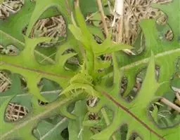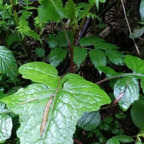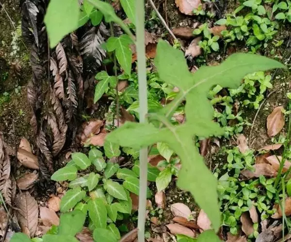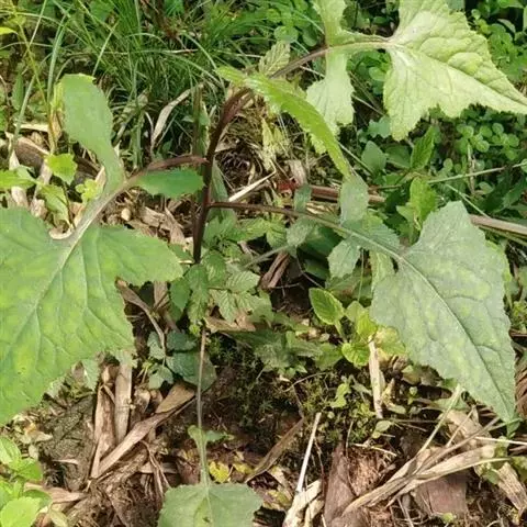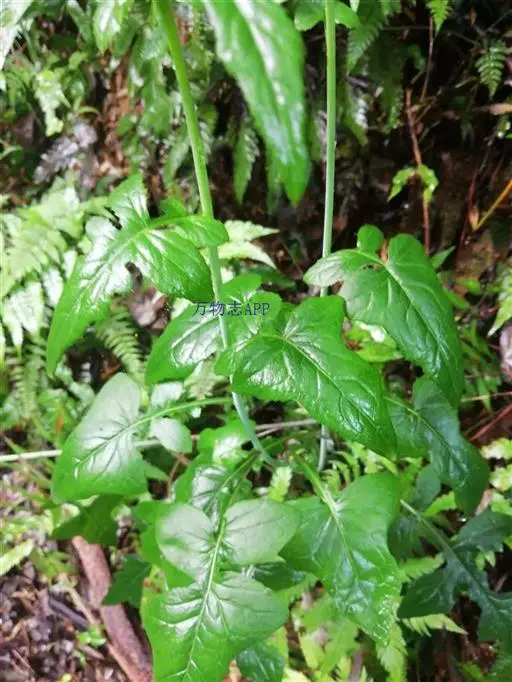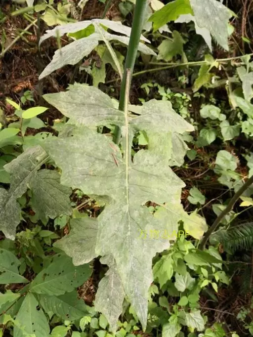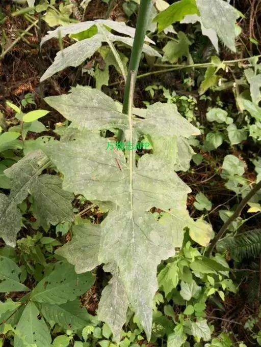 7 基生叶花期枯萎;下部及中部茎叶大头羽状半裂或深裂或几全裂,极少羽状深裂或几全裂,有长4-7厘米的狭或宽翼柄,顶裂片大,宽三角状戟形、三角状心形、三角形或宽卵状三角形,长5.5-15厘米,宽5.5-15厘米,顶端急尖,边缘有大或小锯齿或重锯齿,齿顶及齿缘有小尖头,基部戟形或心形或平截,极少顶裂片与侧裂等大或几等大,披针形或不规则菱状披针形,长4-11厘米,宽3-7厘米,侧裂片1-2(3)对,椭圆形,下方的侧裂片更小,三角状锯齿形,全部侧裂顶端圆形或急尖,有小尖头,边缘有小尖头状锯齿;羽轴有宽或狭翼;上部茎叶小,不裂,戟形、卵状戟形、披针形或长椭圆形,有短翼柄或无柄;全部叶两面无毛。