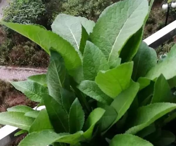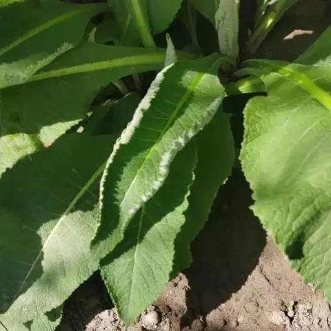 茎基部叶较疏,基部渐狭成具翅具长达20厘米的柄,叶片椭圆状披针形至披针形,长10~40厘米,宽10~25厘米,先端尖,边缘不规则的齿或重齿,上面被基部疣状的糙毛,下面被黄绿色密茸毛,叶脉在下面稍隆起,网脉明显;中部叶卵圆状披针形或长圆形,较小,基部心形,半抱茎;上部叶披针形,小。