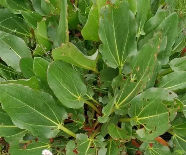 基生叶4-6片,茎生叶及叶状苞片多数;下部叶卵形倒卵状椭圆形,长9-14厘米,宽6.5-9厘米,稀稍大,顶端圆钝,基部近心形或圆形,全缘,基出脉5-7条,一般中间3条特别粗壮,两面均无毛,稀于主脉或叶缘上具短乳突状毛;叶柄与叶片近等长或稍长,半圆柱状,无毛;托叶鞘大,长约7厘米,内外两面均无毛,棕色,干后膜质;上部叶及叶状苞片较窄小叶片长卵形,一般为浅绿色,干后近膜质;叶柄亦较短或无柄。