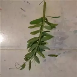 偶数羽状复叶长7-12厘米,叶轴顶端卷须发达;托叶半戟形,有2-4裂齿;小叶5-7对,长卵圆形或长圆披针形,长0.6-3厘米,宽0.4-1.3厘米,先端钝或平截,微凹,有短尖头,基部圆形,两面被疏柔毛,下面较密。