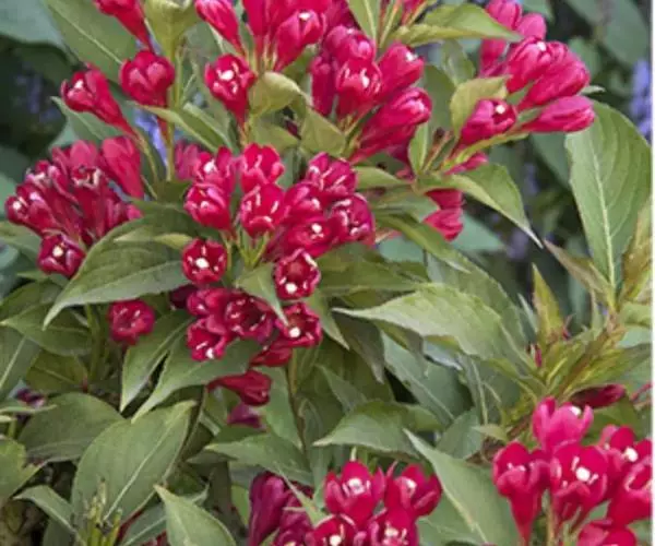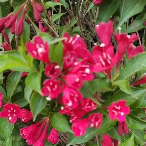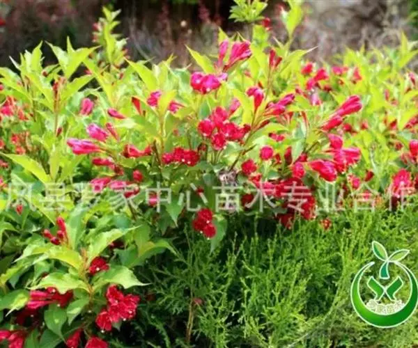 红王子锦带花,系锦带花的一个园艺品种,是从美国引进的优良树种。夏初开花,花朵密集,花冠胭脂红色,艳丽悦目,花期长达一月之久,从5月初始花,可延续到6月上中旬,花序下有盛开的花朵。可孤植于庭院的草坪之中,也可丛植于路旁,树形格外美观。