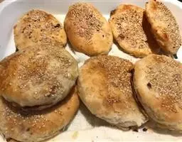 淄川烧饼 淄川肉烧饼是山东淄博的一种传统美食,具有 饼皮香脆、馅味鲜美之特点,相传已有一千多年的历史。主料是面粉,配料有猪肉、大葱、芝麻、酱油、盐等。因亦有无肉配方,故也称“淄川烧饼”。