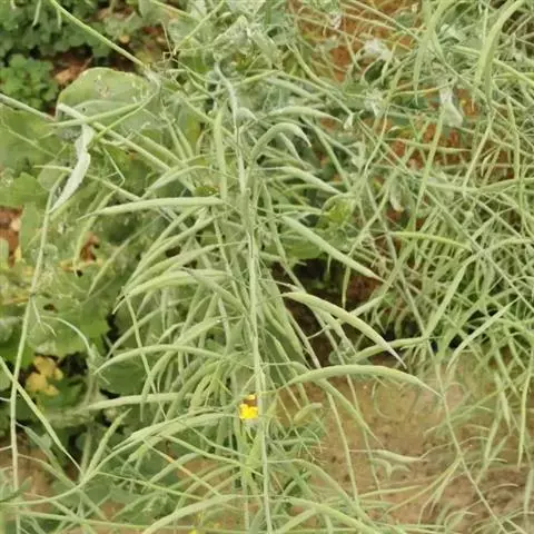 花鲜黄色,直径1.2-1.5厘米;花梗长4-6毫米;萼片长圆形或卵状披针形,长4-5毫米,直立,淡绿色至黄色;花瓣倒卵形,长7-8毫米,基部渐窄成爪。长角果较粗短,长3-6厘米,宽约3毫米,两侧压扁,直立,喙长4-10毫米,宽约1毫米,顶端圆;果梗开展或上升,长2.5-3厘米,较粗。种子球形,直径1-1.5毫米,棕色。花期5月,果期6月。