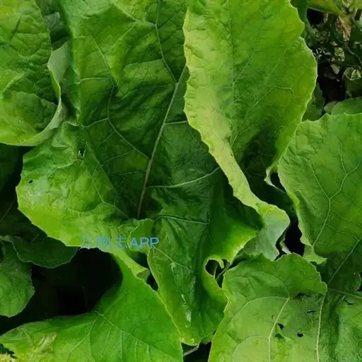 基生叶大,倒卵状长圆形至倒卵形,长30~60厘米,顶端圆钝,边缘皱缩,波状,有时具不显明牙齿,中脉白色,很宽;有多数粗壮的侧脉,叶柄白色,扁平,长5-9厘米,宽2-8厘米,边缘有具缺刻的宽薄翅;上部茎生叶长圆状卵形、长圆披针形至长披针形,长2.5-7厘米,顶端圆钝至短急尖,全缘或有裂齿,有柄或抱茎,耳状,有粉霜。