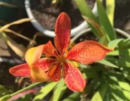 射干(学名:Belamcanda chinensis (L.)Redouté)为多年生草本。根状茎为不规则的块状,斜伸,黄色或黄褐色;须根多数,带黄色。茎直立,茎高1~1.5米,实心。