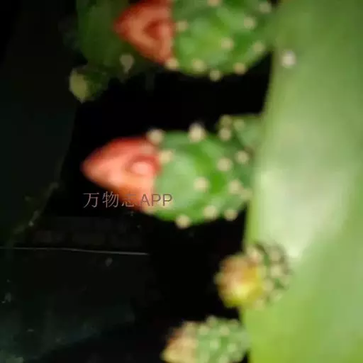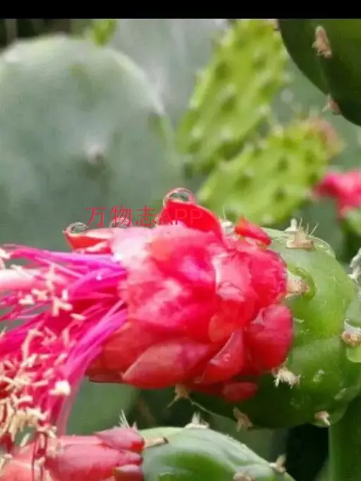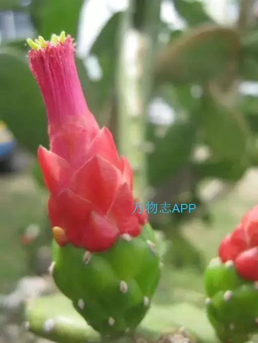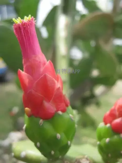 叶钻形,长3-4毫米,绿色,早落。花近圆柱状,直径1.3-1.5厘米;花托倒卵形,长2.5-3.5厘米,先端截形,顶部凹陷,暗绿色,无毛,具稀疏的小窠,小窠无刺,具短绵毛和倒刺刚毛;花被片直立,红色,萼状花被片鳞片状,宽三角形或半圆形,长5-12毫米,宽6-9毫米,先端圆形或急尖,边缘全缘,瓣状花被片卵形至倒卵形,长13-15毫米,宽6-10毫米,先端急尖至钝圆,边缘全缘或波状;花丝红色,直立并外伸,长30-40毫米;花药粉红色,长1.5毫米;花柱粉红色,长40-45毫米,直径1-1.5毫米,基部增粗;柱头6-8,长3毫米,淡绿色。