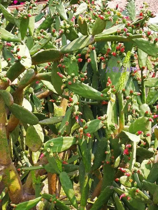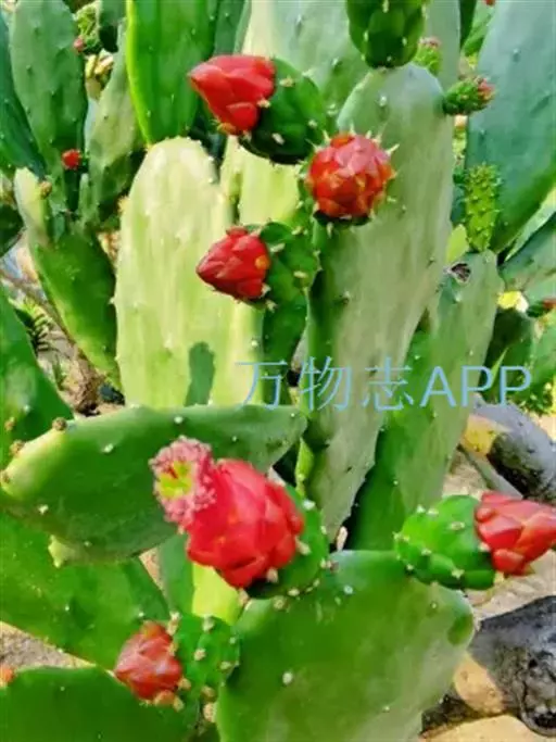 胭脂掌(学名:Opuntia cochinellifera (Linn.) Mill.)仙人掌科肉质灌木或小乔木,高2-4米,圆柱状主干直径达15-20厘米。分枝多数,椭圆形、长圆形、狭椭圆形至狭倒卵形,无毛,暗绿色至淡蓝绿色;小窠散生,不突出。叶钻形,绿色,早落。花近圆柱状;花托倒卵形,暗绿色,无毛;花被片直立,红色,萼状花被片鳞片状,宽三角形或半圆形;花丝红色;花药粉红色;花柱粉红色,基部增粗;柱头淡绿色。浆果椭圆球形,无毛,红色,每侧有10-13个小而略突起的小窠,小窠无刺。种子近圆形,无毛,淡灰褐色。花期7月至翌年2月。