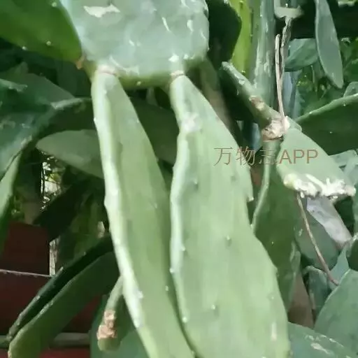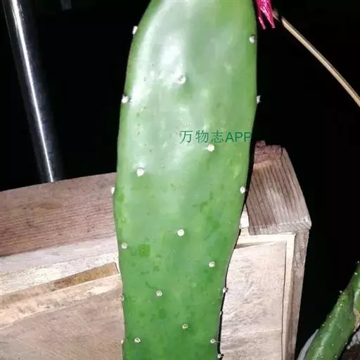 肉质灌木或小乔木,高2-4米(在原产地可高达9米),圆柱状主干直径达15-20厘米。分枝多数,椭圆形、长圆形、狭椭圆形至狭倒卵形,长8-40(-50)厘米,宽5-7.5(-15)厘米,先端及基部圆形,边缘全缘,厚而平坦,无毛,暗绿色至淡蓝绿色;小窠散生,直径约2毫米,不突出,具灰白色的短绵毛和倒刺刚毛,通常无刺,偶于老枝边缘小窠出现1-3根刺;刺针状,淡灰色,开展,长3-9毫米,基部直径约1毫米;倒刺刚毛多数,褐色,早落。