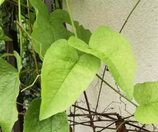 多年生攀援藤本,长达10米。茎自肥厚的块根发出,稍木质,有稜角和卷须,生棕褐色短柔毛。叶有短柄;叶片卵形或卵状三角形,长6-12厘米,宽4-5厘米,顶端渐尖,基部心形,近全缘,两面都有棕褐色短柔毛,下面毛较密,叶脉明显;托叶鞘极小。