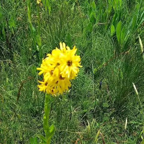 多年生灰绿色草本。根肉质,近似纺锤形。茎直立。舌状花黄色,舌片宽椭圆形或卵状长圆形;管状花多数,冠毛白色与花冠等长。瘦果倒披针形,具肋,光滑。花果期7-11月。