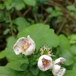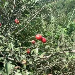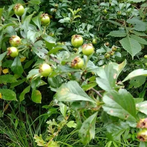 果实近球形或梨形,果形较大,直径可达2.5厘米,深亮红色,有浅色斑点;小核3-5,外面稍具稜,内面两侧平滑;萼片脱落很迟,先端留一圆形深洼。花期5-6月,果期9-10月。